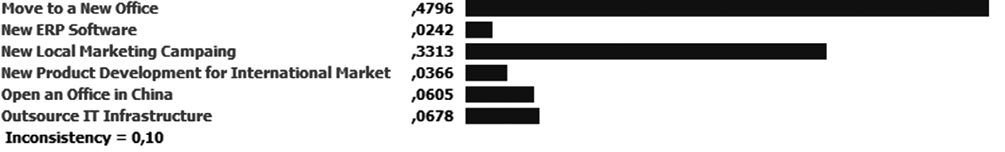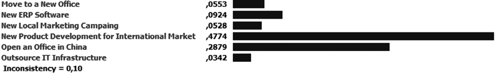 Figure 23 shows that the project with the highest level of adherence to the defined goal is “Development of a New Product for the International Market”. It contributes with 34.39% (0.3439). In order to better illustrate the importance of the difference between the weights and priorities of each project, this project contributes about three (3) times more to the goal than the New Local Marketing Campaign project, which contributes with only 13.1% (0.131) to the global goal.