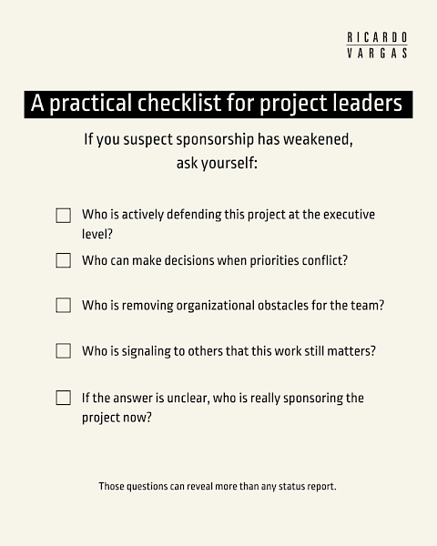 Do not confuse nominal sponsorship with active sponsorship. A name on the org chart is not enough. If the sponsor is no longer involved in decision-making, conflict resolution, and visible support, the project poses a governance risk.