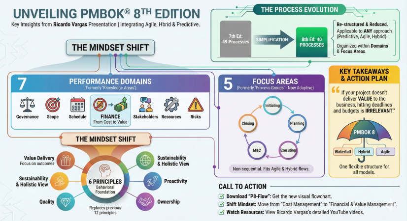 One of the biggest changes in the PMBOK® Guide 8th Edition that really caught my attention is how the traditional process groups — Initiating, Planning, Executing, Monitoring & Controlling, and Closing — have evolved into broader performance domains. The focus is now on outcomes rather than following rigid processes. Communication has also shifted. It’s no longer a standalone knowledge area but is now part of stakeholder engagement.