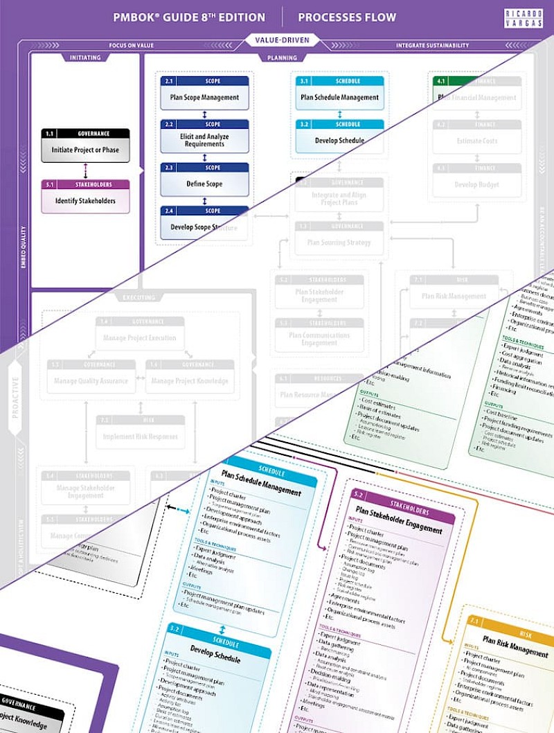 Na versão completa, os 40 processos da oitava edição são apresentados de acordo com sua Área de Foco, exibindo seus títulos e todas as suas Entradas, Ferramentas e Técnicas e Saídas. A versão simplificada do fluxograma apresenta apenas os títulos dos processos e pode ser impressa em formato A3.